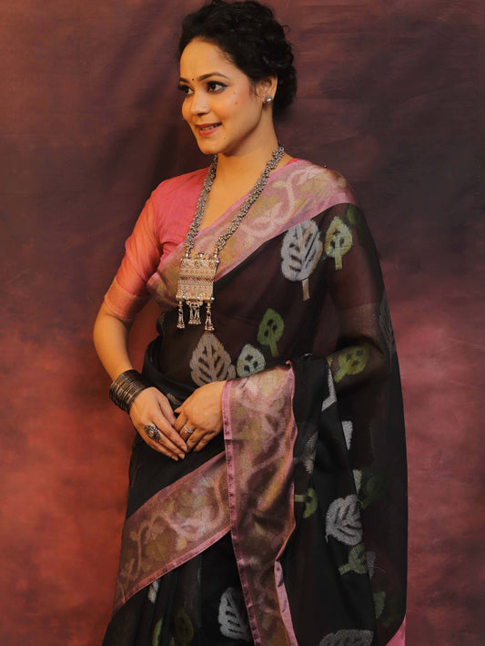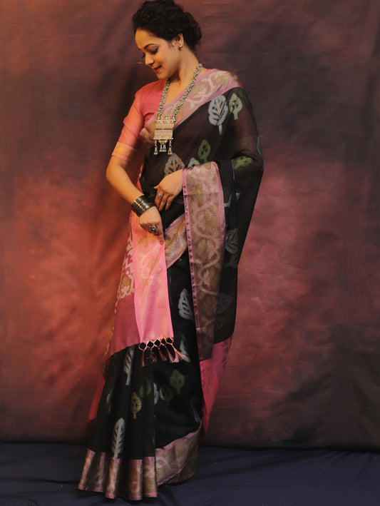Pure Banarasi Cotton Saree Black And Pink Colour